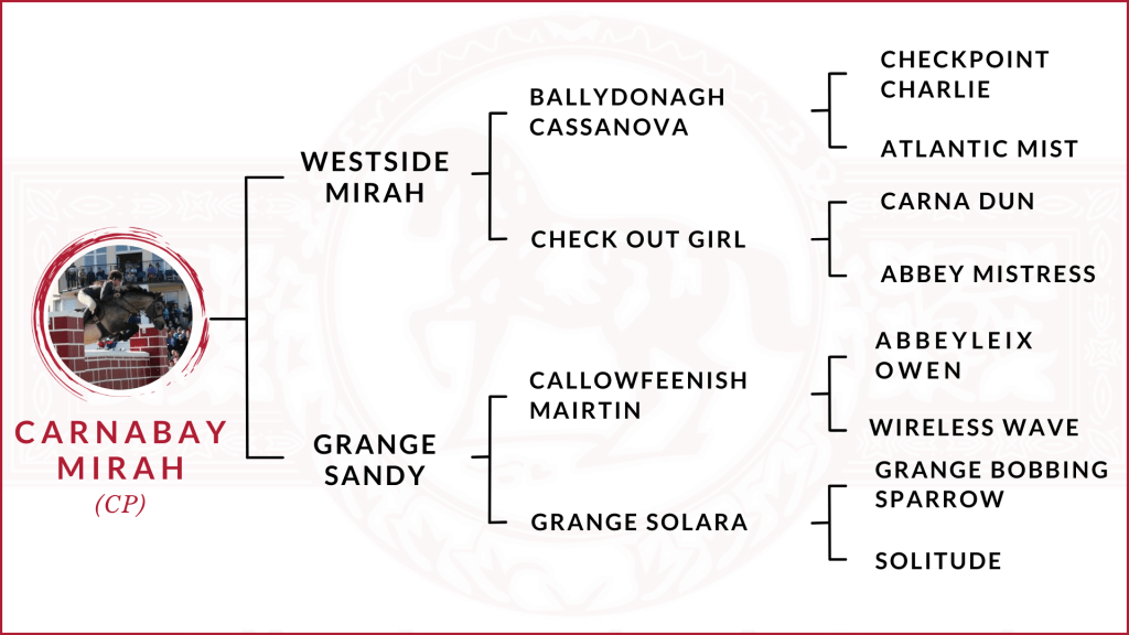 Carnabay Mirah is a standout Class 1 Connemara stallion, widely respected for his exceptional jumping talent, proven performance record, and influential pedigree. With a strong presence in both Irish and international breeding circles, he continues to shape the future of performance-bred Connemaras.
